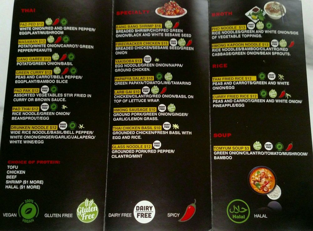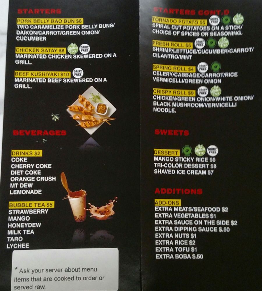 Diving deeper into the menu, dessert lovers will particularly enjoy the Mango Sticky Rice. This seasonal delight is not just a treat for your taste buds but is also vegan, gluten-free, and dairy-free, making it a guilt-free indulgence. Drizzled with a coconut glaze and topped with roasted coconut flakes, it complements any meal beautifully and is priced at $7.50.