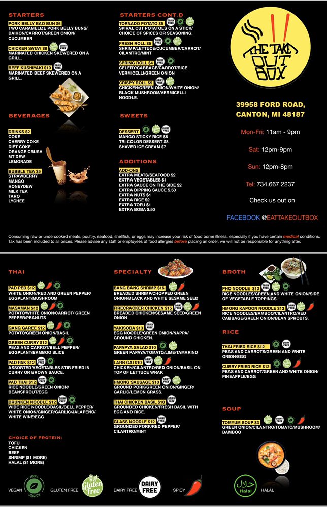 At The Takeout Box- Canton, we believe in crafting exceptional dining experiences that go beyond mere convenience. Nestled in Canton, Michigan, our establishment specializes in Asian fusion cuisine, offering an enticing menu filled with delightful options for everyone, including a variety of vegetarian and vegan dishes. Customers rave about our Firecracker Chicken, flavorful Tom Yum soup, and delectable mango sticky rice. With a commitment to quality and service, we prioritize accommodating dietary preferences and allergies while ensuring timely orders. Whether you dine in or take out, you can always expect a welcoming atmosphere and a passion for great food—supporting our local, family-owned ethos.