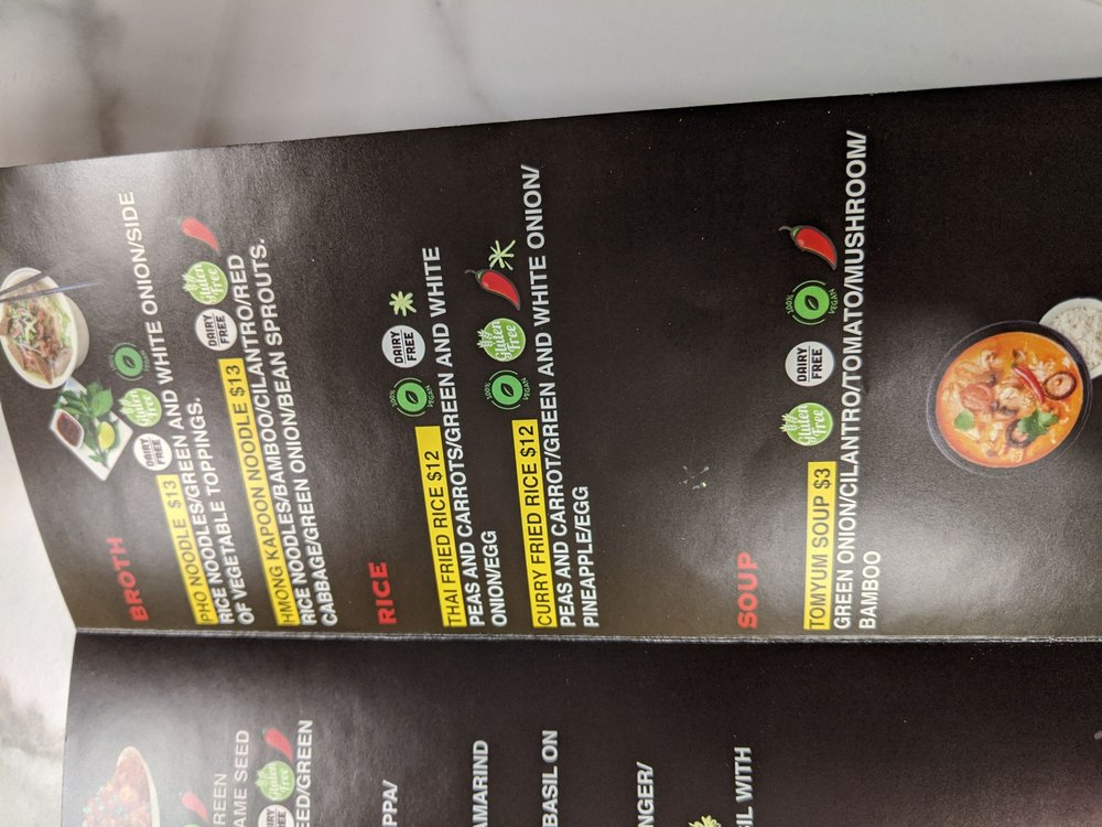 If you're in the mood for something comforting, don't miss their Tom Yum soup, available in both small and large portions. This mildly spiced broth, brimming with green onions, cilantro, tomatoes, mushrooms, and bamboo, is perfect for warming you up on a chilly day. Whether you opt for the small at just $6.50 or the large for $11.50, it's hard not to fall in love with its rich flavors.
